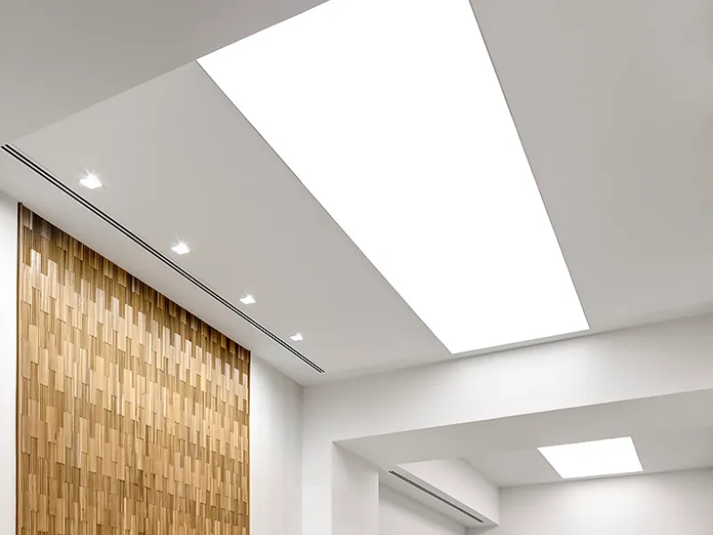 Отличается аккуратной теневой линией и минималистичным видом. Полотно устанавливается в специальный теневой профиль, что создаёт эффект «парящего» светового окна. Подходит для интерьеров, где важна строгая геометрия и чистая визуальная линия.